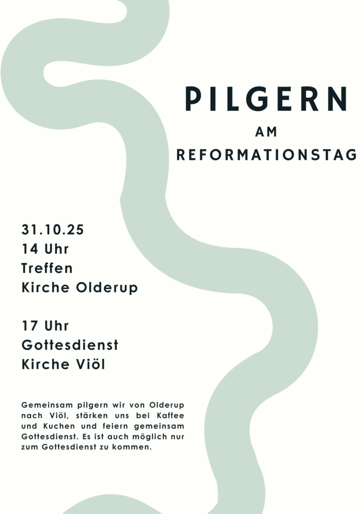 Am Reformationstag pilgern wir gemeinsam mit den Kirchengemeinden Hattstedt/Olderup und Schwesing von der Kirche in Olderup nach Viöl. Auf dem Weg wird es verschiedene Impulse geben. In Viöl stärken wir uns bei Kaffee und Kuchen und feiern dann gemeinsam Gottesdienst in der Viöler Kirche.